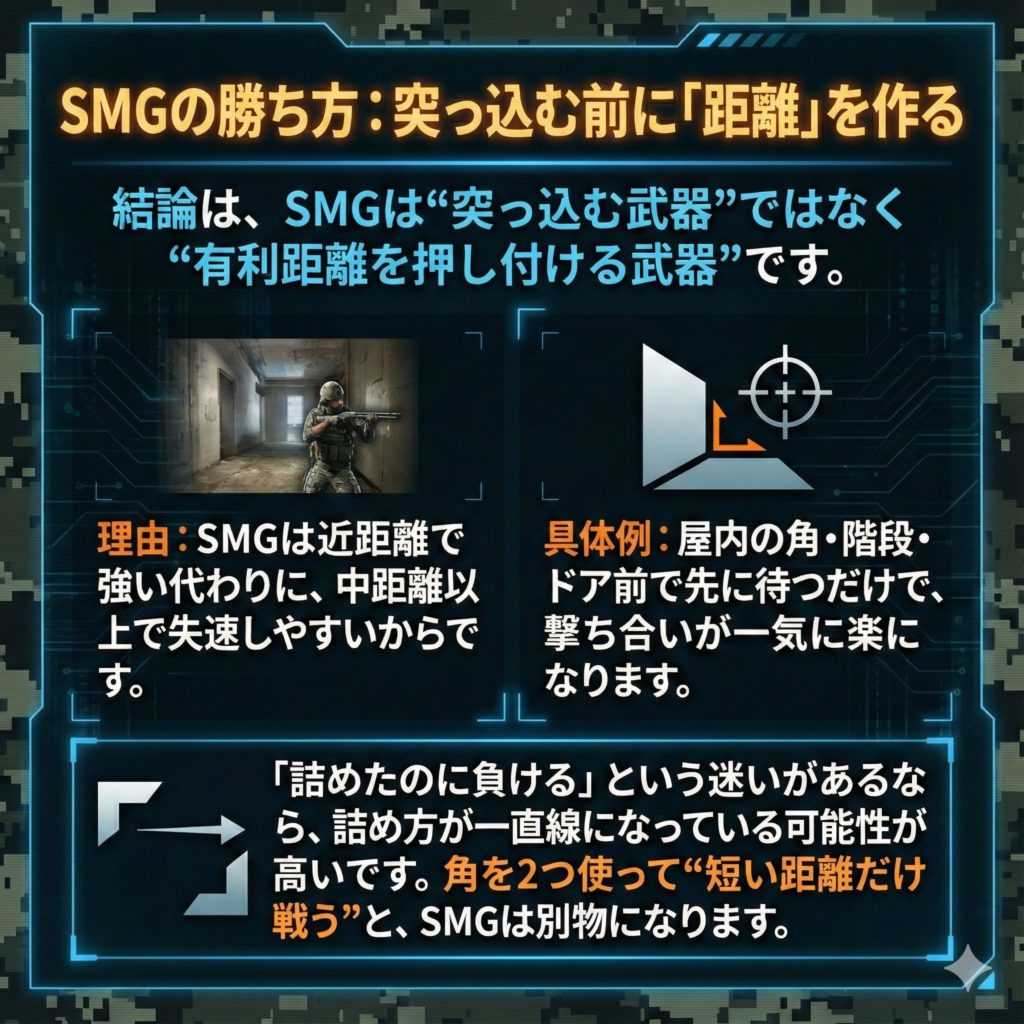 結論は、SMGは“突っ込む武器”ではなく“有利距離を押し付ける武器”です。