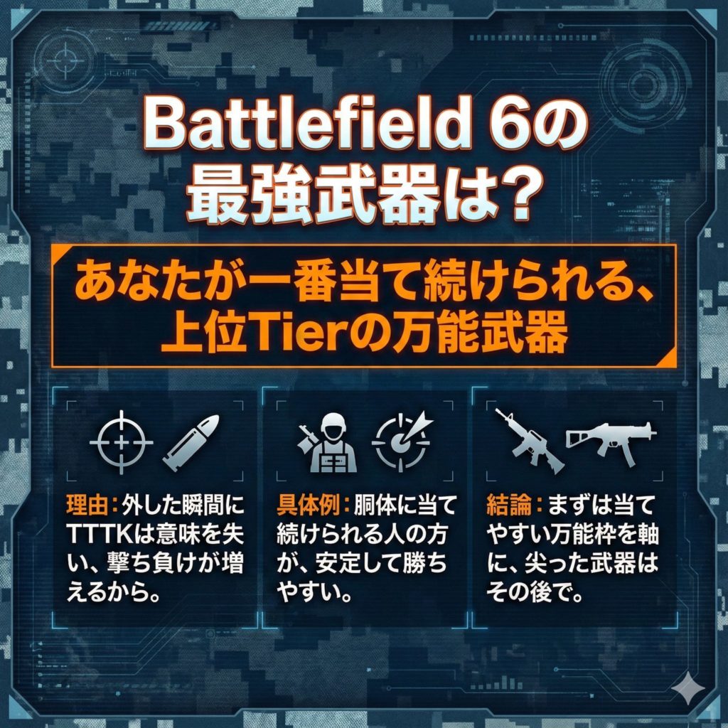 結論から言うと、Battlefield 6の最強武器は「あなたが一番当て続けられる、上位Tierの万能武器」です。
