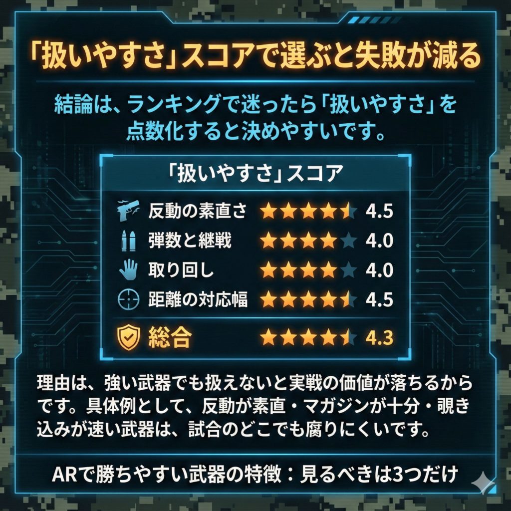 具体例として、AR選びでまず見るべきは、反動の素直さ、弾数、ADS(覗き込み)の体感速度です。