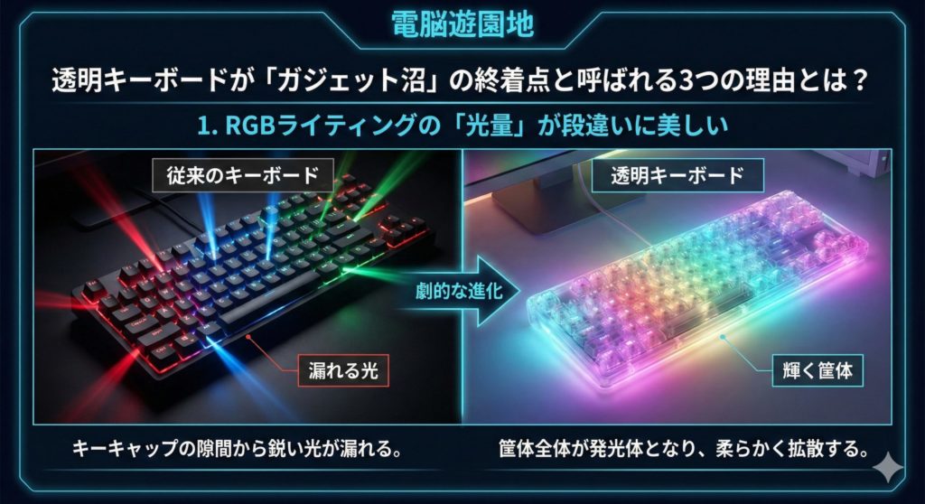 - スイッチまで透明: 「クリスタルキースイッチ」を採用しており、LEDの透過率が半端じゃありません。