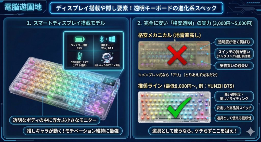 最近の透明キーボードは、ただ光るだけでは飽き足らず、とんでもない進化を遂げています。
