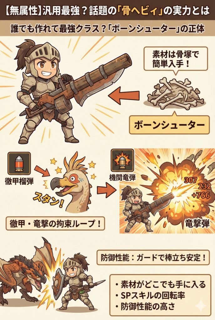 まずは手軽な「ボーンシューター」でガードとリロードの感覚を掴み、徐々に属性武器へとステップアップしていくのが、一流ガンナーへの近道です。