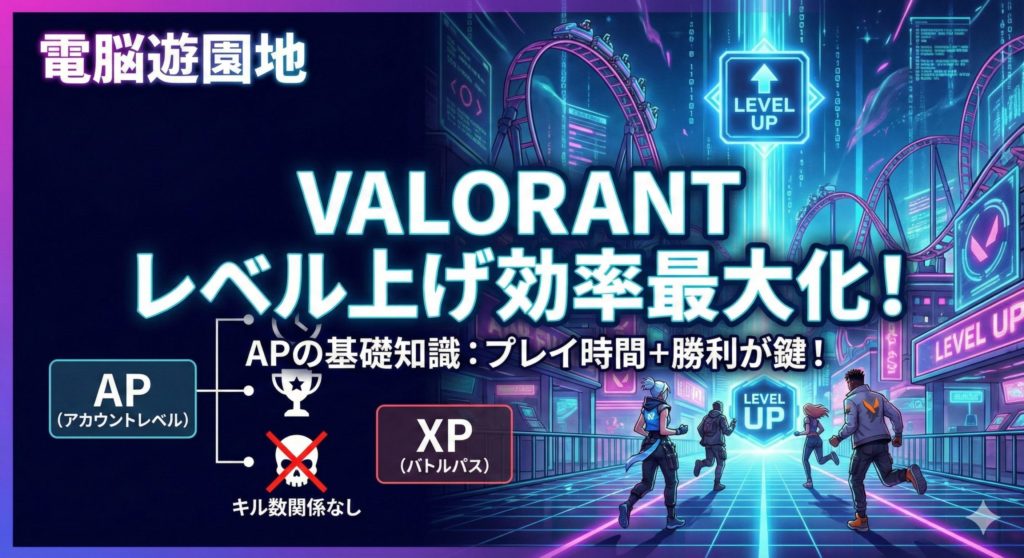 VALORANTでレベルを効率よく上げるためには、まず「AP(アカウントポイント)」の計算式を正しく理解する必要があります。多くの初心者が「XP(経験値)」と混同しがちですが、バトルパスを進めるXPと、アカウントレベルを上げるAPは別物です。