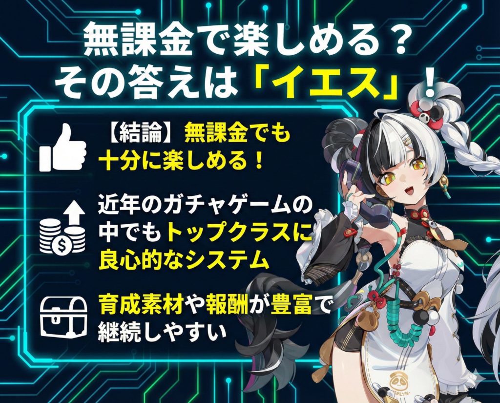 つまり、ゼンレスゾーンゼロは「最強の相棒(ボンプ)を無料で選べる」という革新的なシステムと、安定した配布量によって、無課金プレイヤーでもエンドコンテンツまで遊べる設計になっているのです。