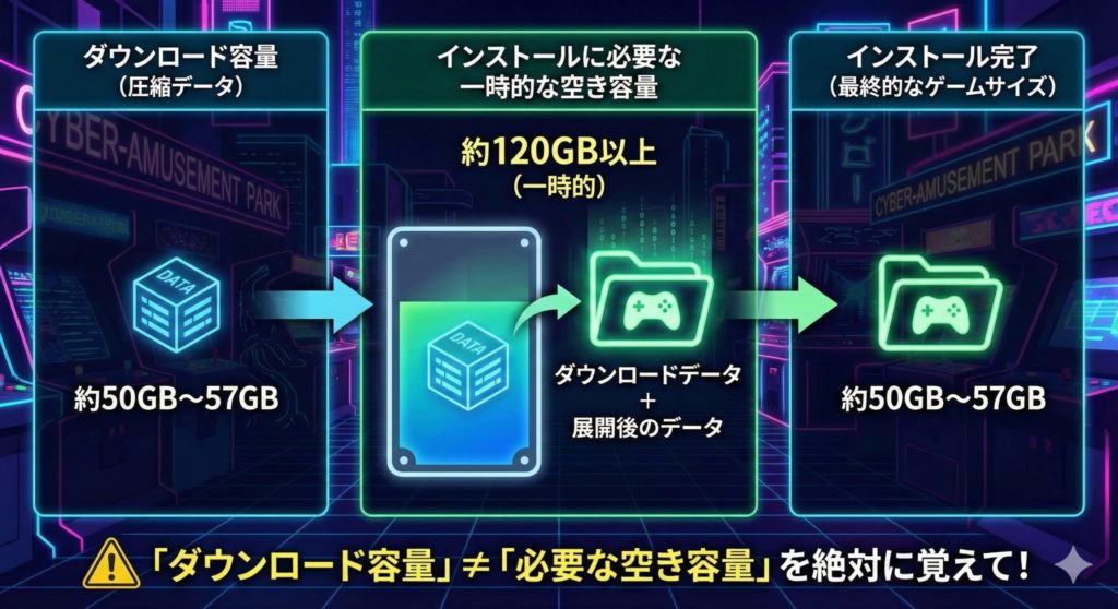 PC版をインストールするには、最終的なゲームサイズの約2倍、具体的には「120GB以上」の空きスペースが一時的に必要になります。